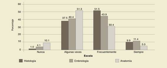 En Anatomía, el 10% no emplea ningúna de las estrategias evaluadas comparado con Biología Celular y Tisular, que sólo el 1% no emplea estrategia. Por otra parte entre un 9 y 11% siempre utilizan algún tipo de las estrategias evaluadas en las asignaturas de Biología Celular y Tisular y en Embriología Humana y sólo el 5% utiliza “siempre” alguna estrategia en Anatomía (figura 3).