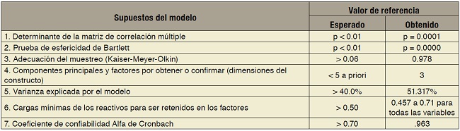 El instrumento, como parte de su calidad psicométrica y como evidencia de validez de la estructura interna19,20, reporta siete criterios y sus valores de referencia que permiten valorar el modelo obtenido (tabla 1).
