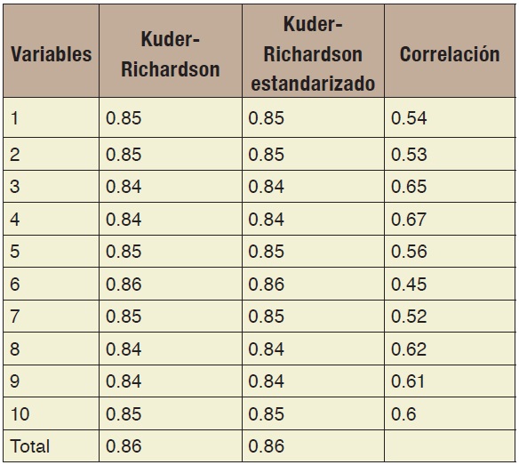 En los resultados observamos una armonía entre 0.84 y 0.86, y si eliminásemos una variable, no se modifica la puntuación tal como se aprecia en el estandarizado, determinándose así una consistencia interna positiva y conveniente; además la correlación se mantiene entre 0.45 y 0.62 interpretándose como correlación positiva, moderada (tabla 1).