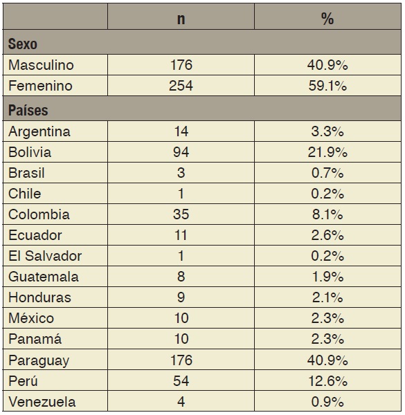 Participaron del estudio un total de 430 estudiantes de medicina de varios países de Latinoamérica: 254 mujeres y 176 hombres (tabla 1), de 16 a 34 años, con una media de 22.06 años y un desvío estándar de 2.46.