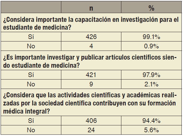 El 99.1% considera importante para el estudiante de medicina la capacitación en investigación, 97.9% considera importante publicar artículos en revistas científicas siendo estudiante, y 94.4% considera que las actividades científicas y académicas realizadas por sus sociedades científicas contribuyen a su formación médica integral (tabla 2).