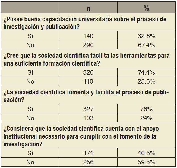Con respecto a la percepción sobre la capacitación universitaria recibida, 67.4% considera que no recibe buena capacitación sobre el proceso de investigación y publicación. En cuanto a las herramientas facilitadas por las sociedades científicas, 74.4% considera que recibe herramientas necesarias para una suficiente formación científica y 76% considera que su sociedad científica fomenta y facilita el proceso de publicación. Sin embargo, solo 59.5% considera que su sociedad científica no cuenta con apoyo institucional para cumplir con el fomento de la investigación científica (tabla 3).