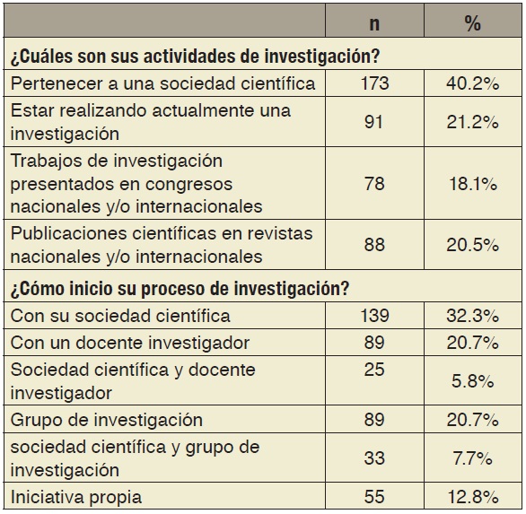 Sobre las actividades de investigación realizadas, 40.2% pertenece a una sociedad científica mientras que solo 20.5% tiene publicado algún artículo en revistas científicas. El 32.3% se ha iniciado en la investigación con su sociedad científica y 20.7% con un grupo de investigación y docente investigador (tabla 4).