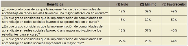 Los estudiantes identifican que las redes sociales representan beneficios directos para su propio aprendizaje (tabla 1). Los estudiantes describen un efecto favorecedor de la experiencia en una mayor oportunidad de interacción (49%) y un mayor efecto en el aprendizaje (52%). Además, 46% asegura que esta actividad actúa como motivación para su aprendizaje. El 44% de los estudiantes, la considera como un mayor reto que favorece su formación.