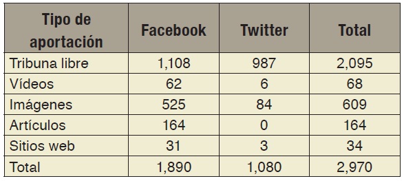 Hubo una gran participación por parte de los alumnos, la mayoría (64%) se dio en Facebook, mientras que el restante se dio en Twitter (26%). De acuerdo con el tipo de aportaciones, las más utilizadas fueron las de tribuna libre con 2,095 aportaciones (equivalentes a un 71%). La información sintetizada de acuerdo al tipo de aportaciones se presenta en la tabla 2.