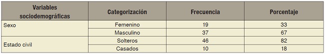 Participaron en el estudio el total de los 56 médicos pasantes de servicio social, pertenecientes a la promoción febrero-enero, con una media de edad de 24, en un rango de 21 a 26 años; 82% estaban solteros y 18% casados (tabla 1).