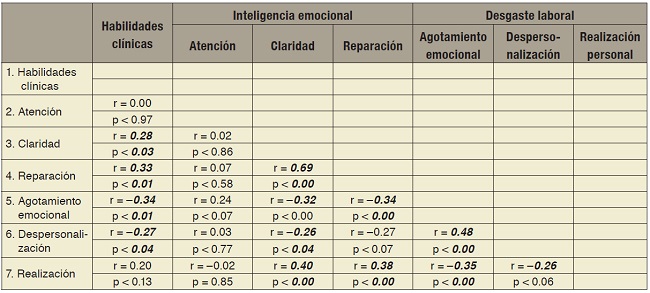 Resultados: Se encontraron relaciones estadísticamente significativas, habilidades clínicas que correlacionó de manera positiva con claridad (r = 0.28; p < 0.03) y reparación (r = 0.33; p < 0.01); de forma negativa con agotamiento (r = −0.34; p < 0.03) y despersonalización (r = −0.27; p < 0.04). Claridad emocional correlacionó de modo negativo con agotamiento (r = −0.32; p < 0.01) y despersonalización (r = −0.26; p < 0.04), y positivamente con realización (r = 0.40; p < 0.00). Reparación de emociones se relaciona de forma negativa con agotamiento (r = −0.34; p < 0.00) y de manera positiva con realización (r = 0.38; p < 0.0).