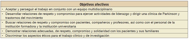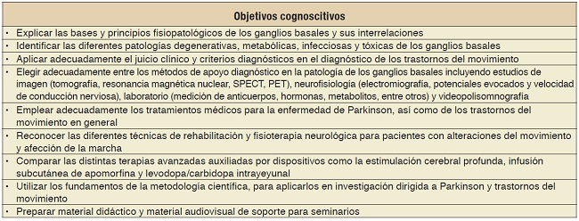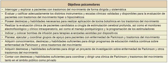De acuerdo con lo propuesto por Díaz-Barriga1 el perfil profesional se estructuró mediante la determinación y organización de contenidos en materias y módulos. Los módulos del temario del CPAEM/EPTM se integran con el Mapa Educacional de la Sociedad Internacional de Parkinson y Trastornos del Movimiento (IPMDS). A grandes rasgos, los contenidos se encuentran estructurados en un plan modular que incluye trastornos hipocinéticos y trastornos hipercinéticos del movimiento. De este último se desprenden los conocimientos y habilidades que se proporcionarán en el CPAEM.