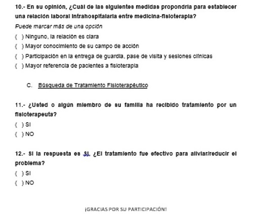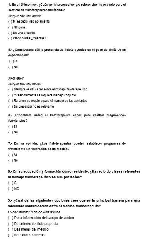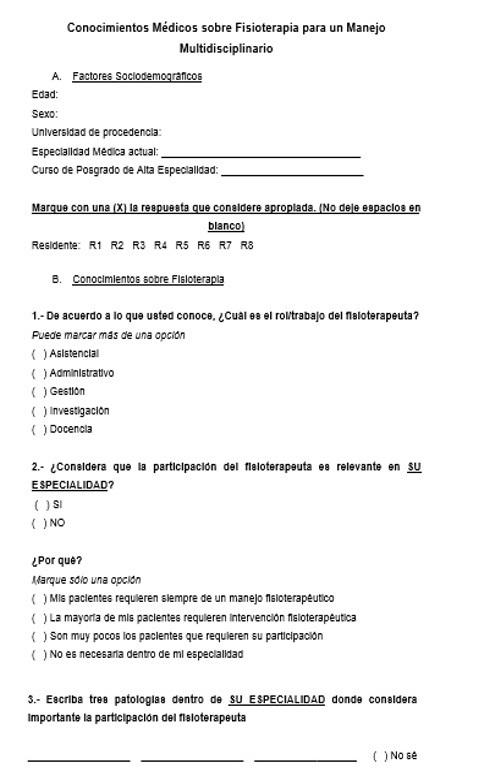 Se construyó un cuestionario semi-estructurado con 12 preguntas, las cuales constaron de 4 opciones de respuesta, algunas de estas con más de una respuesta posible. Los cuestionarios fueron construidos para fines del presente estudio por dos expertos en fisioterapia con experiencia de más de 5 años de ejercicio clínico fisioterapéutico y por dos médicos, uno experto en metodología de investigación y otro pasante de la licenciatura de medicina. El contenido de las preguntas y posibles respuestas de opción múltiple se consensaron entre este grupo de expertos. Los cuestionarios recabaron información sobre características socio-demográficas de los médicos, se mantuvo el anonimato y fueron de autollenado. Las preguntas fueron divididas en dos dominios: el primero, acerca del conocimiento de las actividades realizadas el fisioterapeuta y el segundo, sobre la percepción médica de la utilidad e importancia de la participación de este profesional en el tratamiento interdisciplinario. Además, se preguntó si los médicos participantes contaban con la experiencia personal o de algún familiar cercano de haber recibido atención fisioterapéutica. De acuerdo a la distribución de los datos obtenidos se empleó estadística descriptiva y se presentan a través de proporciones. Los datos fueron analizados a través de SPSS Ver. 24.