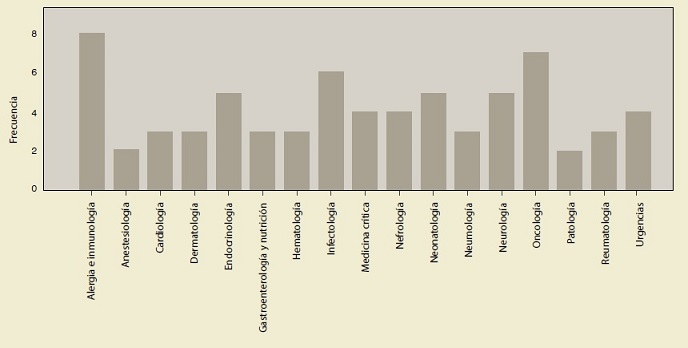 La mayoría de los médicos cursaban alguna especialidad pediátrica médica, seguidos por el grupo de pediatras generales y los residentes de los diferentes Cursos de Posgrado de Alta Especialidad en Medicina. Tabla 1.