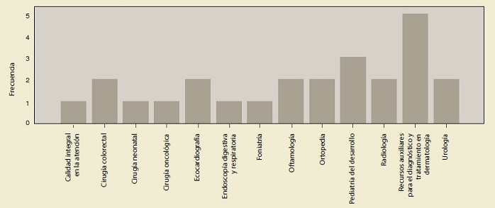 Para facilitar su análisis, los cursos de especialidades pediátricas fueron divididos en especialidades pediátricas médicas, quirúrgicas y Cursos de Posgrado de Alta Especialidad en Medicina, su distribución se presenta en las Figuras 1 y 2. Nueve de los médicos residentes pertenecían a alguna especialidad pediátrica quirúrgica (cirugía general, otorrinolaringología y neurocirugía).