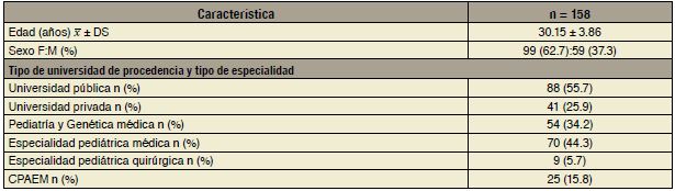 Se aplicó el cuestionario a 158 médicos residentes cuyas características sociodemográficas al ingreso del estudio se muestran en la Tabla 1.