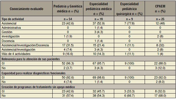 El grupo de pediatras (31.5%) y los residentes de los CPAEM (32%) refirieron que los fisioterapeutas desempeñan más de una actividad como: investigación, docencia y pocos de ellos respondieron funciones relacionadas con gestión y administración. Tabla 2