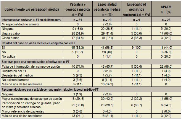 La mayoría de los pediatras (83.3%) y residentes de una especialidad pediátrica quirúrgica (100%) consideraron útil realizar el pase de visita con algún fisioterapeuta aunque los especialistas pediatras del área médica (40%) y los residentes de los CPAEM (36%) no lo consideraron útil. Tabla 3