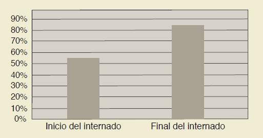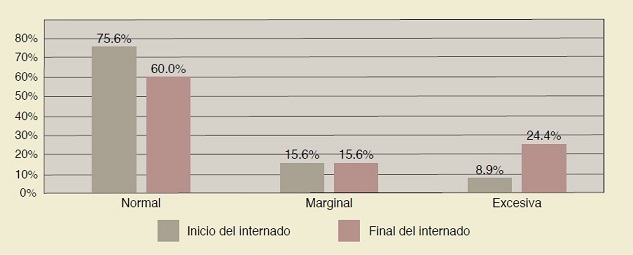 Una de las principales manifestaciones clínicas de la mala calidad del sueño es la somnolencia diurna excesiva, la cual casi se vio triplicada en el presente estudio ya que pasó de 8.9% (4) al comienzo del internado a 24.4% (11) al finalizarlo.