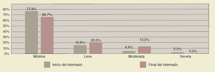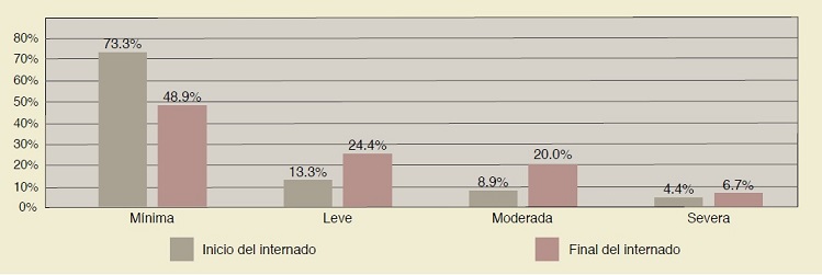 Conclusions: Both anxiety and depression showed an important increase of their prevalence by the end of the medical internship. Due to these situations, we recommend to implement periodically evaluations, prevention strategies and to assess the influence of several stressors.