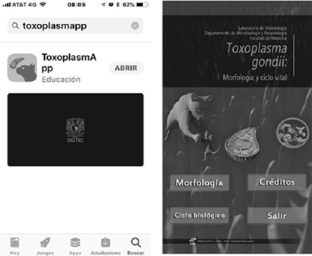 Objective: Developed and assessed an app for the study of morphology and the biological cycle of the Toxoplasma gondii parasite, for the students of the Parasitology module of the academic subject Microbiology and Parasitology of the of the Faculty of Medicine, UNAM, in order to reinforce and include data of the toxoplasmosis disease that is one of the most complex parasitosis being studied in this module.