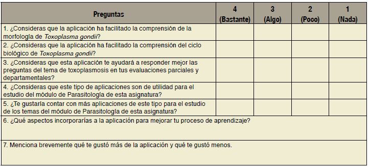 El 93% de los estudiantes que respondieron el cuestionario, consideró que la aplicación les facilitó bastante la comprensión de la morfología de Toxoplasma gondii, el 91%, consideró que la aplicación les facilitó bastante la comprensión del ciclo biológico de Toxoplasma gondii. El 48% manifestó que la aplicación les ayudaría bastante a responder mejor las preguntas del tema de toxoplasmosis en sus evaluaciones parciales y departamentales, el 1% mencionaron que les ayudaría algo y el resto que les ayudaría poco, esta respuesta fue coincidente con las preguntas abiertas en las que los evaluados pidieron que se incluyeran más datos clínicos en la aplicación. El 93% de los estudiantes manifestaron que este tipo de aplicaciones se le hace bastante útil para estudiar parasitología y 96% quieren contar con más aplicaciones de este tipo para el curso ya que les fue de fácil acceso y la pudieron estudiar hasta en su trayecto a la facultad sin necesidad de cargar con libros o apuntes, simplemente abriendo su teléfono móvil. La mayoría coincide que la aplicación necesita audio y mayor contenido clínico, así como una explicación breve de la función de los organelos más importantes del parásito.