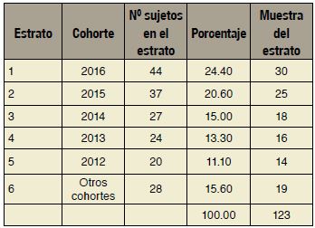 Muestra: La muestra fue probabilística estratificada. Previamente se determinó el tamaño muestral mínimo de 123 estudiantes, considerando un error alfa del 5% y un error beta del 20%, según lo especificado en la siguiente Tabla1