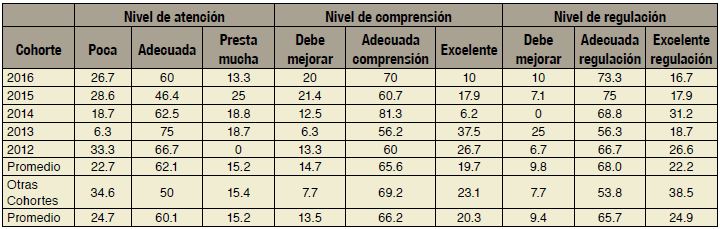 Cabe destacar que los niveles de inteligencia emocional más bajos se presentan en la atención de inteligencia emocional, donde un 24,7 % de la muestra total debe mejorar ya que presta poca atención a sus emociones y un 15,2% debe mejorar ya que presta mucha atención a las emociones. Un 60,1% de la muestra presenta adecuada atención. En cuanto a la comprensión, solo un 13,2 % debe mejorar y un 66,2% presenta niveles adecuados y un 20,3 % excelente, mientras que un 9,4% debe mejorar la regulación de inteligencia emocional, un 65,7% presenta niveles adecuados y un 24,9% excelente. Destaca que la cohorte 2013 presenta bajos niveles de regulación emocional en relación a las demás cohortes.