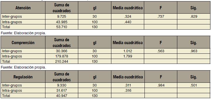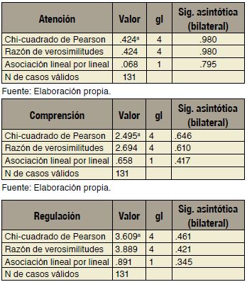 Según la prueba estadística realizada de ANOVA, no se encontraron diferencias significativas entre el nivel de atención (p=0,829), el nivel de comprensión (p=0,963) y el nivel de regulación (p=0,501) con el promedio de notas (Tabla 4). En relación a los niveles de Inteligencia emocional y avance curricular (Tabla 5), aplicando la prueba de chi cuadrado, no se encontró asociación con atención (P= 0,980), así como entre los niveles de comprensión (p= 0,646) y regulación (p=0,461).