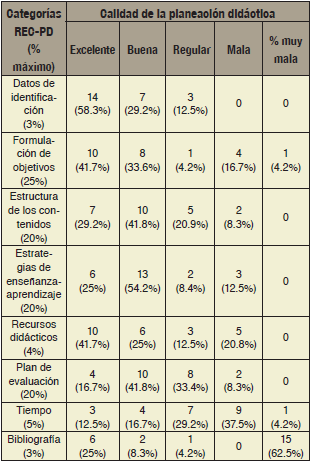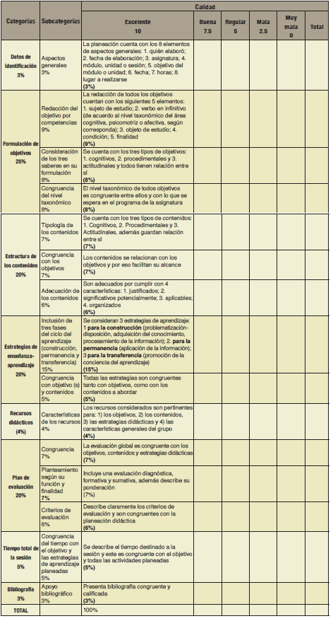 Para la evaluación de la calidad de las PD se construyó una rúbrica, “Rúbrica para evaluar la calidad de la planeación didáctica” (REC-PD), bajo los criterios de López.21 y los contenidos del propio DPDES para elebaorar correctamente una PD. Incluye 8 categorías (ver tabla 3), con un máximo porcentual de 100. Según el la calificación porcentual, la calidad de la PD se clasifica en cinco grados: muy mala, mala, regular, buena y excelente. La REC-PD se acompaña de un glosario de 9 términos para facilitar su aplicación. Se validó por ronda de expertos, considerando el método propuesto por Barraza.22 La confiabilidad de la REC-PD se valoró por medio de test-retest y obtención de una correlación con la prueba de de Spearman.23,24,25