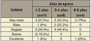 Resultados: Confiabilidad de la REC-PD rs=0.9; concordancia inter observador k=0.84; intra observador k=1. La calidad de las PD en la mitad de los casos fue de muy mala a mala. Correlación entre calidad de las PD y tiempo de egreso del DPDES, rs=-0.238 (p=0.263). Correlación entre la calidad de PD y años de experiencia docente, rs= -0.248 (p= 0.242).