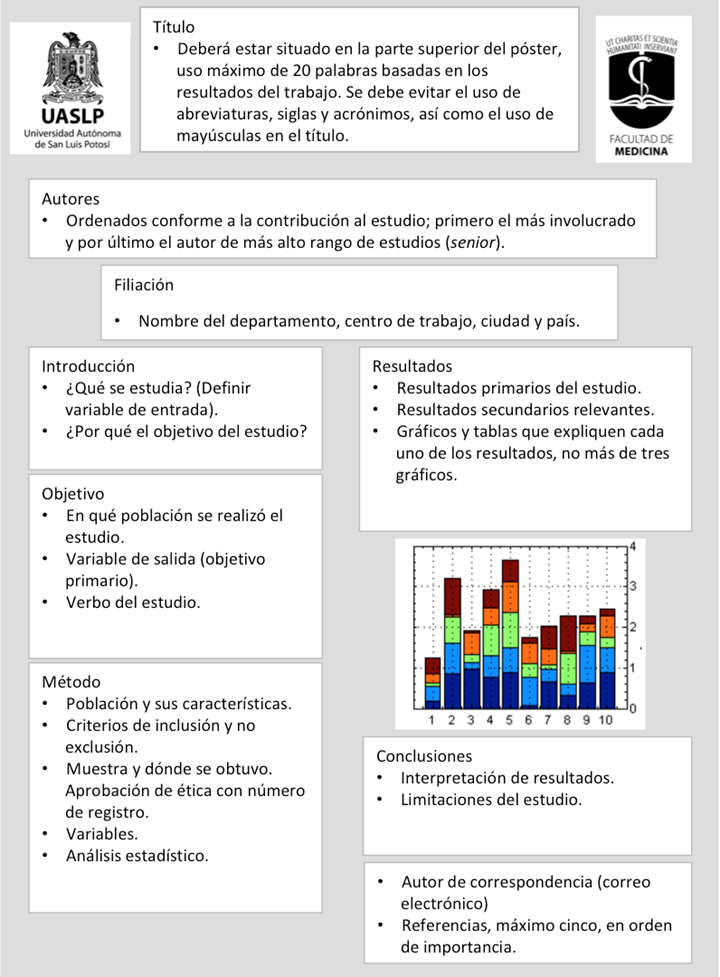 Se deben de respetar las correctas medidas de tamaño del póster, así como el tipo y tamaño de fuente, orden del contenido, gráficas y colores, para el correcto entendimiento de su trabajo.