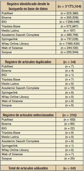 Otras fuentes utilizadas fueron las bases de datos multidisciplinarias: Academic Search Complete, Springer Link, Wiley Online Library, Web of Science y Scopus, además Medic latina como base de datos especializada en el área médica.