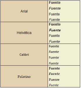 Se recomienda el uso de un tipo de fuente que sea fácil de leer y que permita el movimiento natural del ojo, las fuentes recomendadas son; Arial, Helvética, Palatino y Calibri (Ver Tabla 2). Algunos autores mencionan la fuente Times New Roman, pero consideramos no conveniente su uso ya que no cumple con los criterios estipulados anteriormente.