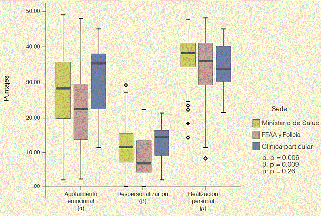 El agotamiento emocional, la despersonalización y la realización personal, obtuvieron en promedio el 27 ± 11, 12 ± 6 y 37 ± 7 puntos, respectivamente. El "agotamiento emocional" y la "despersonalización" obtuvieron diferencias significativas en los puntajes obtenidos entre las diversas sedes (Ministerio de Salud, FFAA-Policía y Clínica Particular) con un p = 0.006 y p = 0.009, respectivamente. Sin embargo, no se encontraron diferencias significativas para el componente de "realización personal" entre dichas sedes (Figura 1).