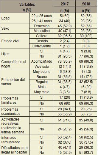 Participaron del estudio 165 internos de medicina: el 52% (n = 85) del internado, del año 2017; y el 48% (n = 80) del internado, del año 2018. Los participantes tenían en promedio 26 ± 3 años de edad, en su mayoría entre 22 y 25 años, del sexo femenino, solteros y sin hijos. Se encontró que 81.3% (n = 65) de los internos del año 2018 percibió su sueño de "regular" a "muy malo", mientras que más de la mitad de los internos del 2017 refirió una "muy buena" y "buena" percepción de su sueño, en un 55.3% (n = 47) (Tabla 1).