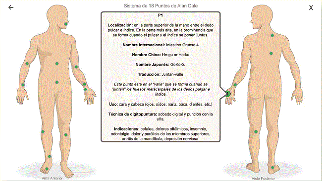 En la multimedia se evidencian los puntos de acupuntura y digitopuntura del sistema de 18 puntos de Alan Dale (Figura 3), utilizados esencialmente en la terapéutica de varias enfermedades y dolencias. Al pasar el cursor por encima de los puntos este se agrandará y mostrará su número, y al hacer clic aparecerá una pestaña donde el usuario tendrá acceso a la información específica de cada uno, de los cuales se puede observar su localización, nombre internacional, chino, japonés y su traducción, así como su uso, técnica con digitopuntura e indicaciones.