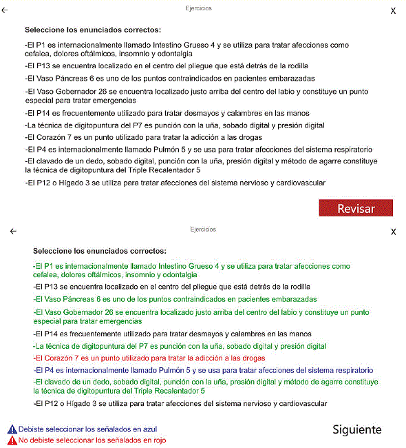 Además, en sus diferentes módulos se pueden apreciar las generalidades, unidades de medida, técnicas, meridianos y los principales puntos utiliza dos para tratar emergencias médicas. Cada módulo cuenta con sus respectivos botones de "Atrás" y salida de la multimedia.