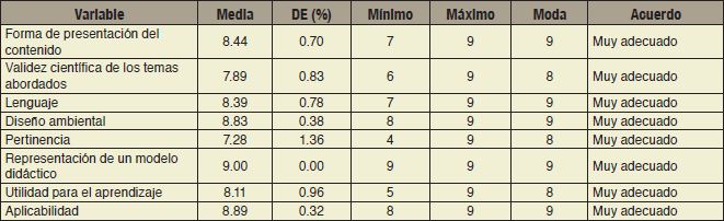 Durante la primera etapa de validación teórica por expertos se evaluaron las siguientes variables con una escala numérica con base en 9 puntos (desde "poco adecuado" hasta "muy adecuado"):