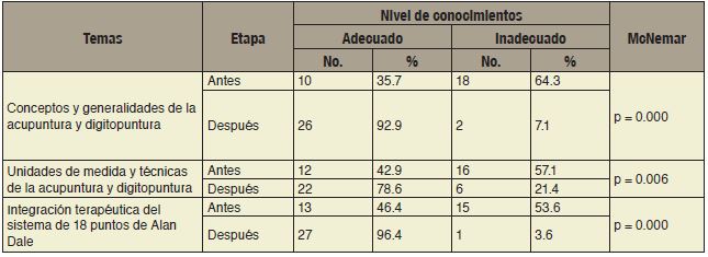 Para el análisis de los resultados se empleó el método matemático-estadístico, se utilizó la estadística descriptiva para mostrar la información en tablas. Se aplicó además el Test de McNemar para comparar los resultados de la preprueba con los resultados de la posprueba, se tomó un nivel de significación del 95% (p < 0.05), y se tomó p no significativo si p > 0.05, significativo si p < 0.05 y muy significativo si p < 0.01. Se trabajó con una base de datos del paquete estadístico SPSS 21.0 para Windows.