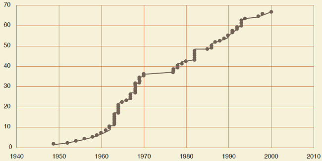 El grado de colaboración calculado fue de 0.378 y se encontraron 53 coautores. Durante el primer período (1949-1970) manufacturó 10 publicaciones en coautoría, un 27.7% del mismo, con un mínimo de 1 y un máximo de 3 firmas, con una media de 1, esto en 7 artículos de 10. Para el segundo intervalo (1977-2000), produjo 15 en cooperación, un 50%, con un mínimo de 1 y un máximo de 6 firmas, con una media en este período de 3, en 7 títulos de 15. Su media de firmas para la totalidad de estudios se sitúa en 3, esto en 9 artículos de 25. Se apreció un claro aumento del número de coautores en sus trabajos conforme el tiempo transcurrió (Figura 2). El Dr. Velasco generó un cúmulo de 41 investigaciones de manera individual y un total de 25 en colaboración, de este acervo, en 18 aparece como primer autor y en 7 como coautor de otros personajes. Los autores con quienes presentó más cooperación son los siguientes, además de apreciar su número de publicaciones: Ramírez Armengol J "4", Castellanos G "4", Escobedo F "3", Nisa Gutiérrez E "3".