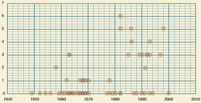 Fueron hallados 67 estudios en total, dándonos un tamaño bibliométrico de 66, ya que 2 de ellos son el mismo artículo, solo difieren en una palabra y firma en la referencia. Su índice de productividad personal es de 1.819. El título más antiguo encontrado es del año 1949, y el más reciente del año 2000. Fue 1963 el año más prolífico en cuanto al número de publicaciones realizadas, con un total de 6 artículos, seguido por los años 1964, 1968 y 1982 con 5 trabajos cada uno. Existe un intervalo que va de 1971 a 1976, este es el período de mayor ausencia en la creación de artículos, no hay registro alguno en la base de datos. Para este trabajo, dividimos en 2 fases el patrón de publicaciones de Dr. Velasco, con base en el lapso antes mencionado: durante el primer bloque (1949-1970) realizó 36 trabajos, y en el segundo (1977-2000) produjo 30 artículos (Figura 1).