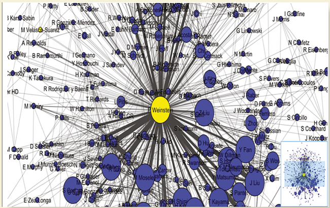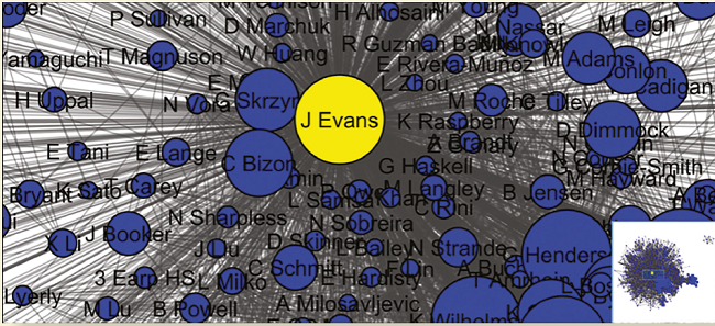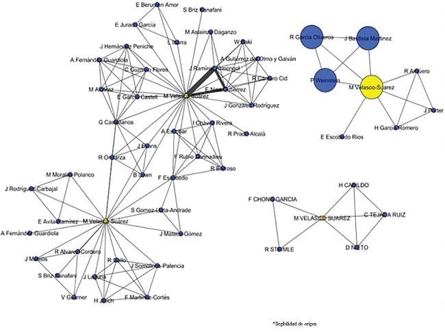 La red del Dr. Velasco reveló diversos investigadores, entre ellos localizamos pequeños (García Oliveros R: 1, Arqüero R: 1), medianos (Nisa Gutiérrez E: 4, González Rodríguez JF: 5) y grandes creadores de artículos (Castellanos G: 56, Jinich H: 61, Weinstein P: 176, Evans J: 414). Más del 50% de sus coautores tienen amplios cúmulos de publicaciones. La intensidad de colaboración de algunos de sus coautores se apreció claramente por el gran entretejido y anchura de las conexiones (Figuras 4 y 5).