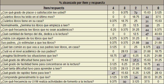 El porcentaje alcanzado por cada ítem, fue la base para la definición del hábito lector (Tabla 1).