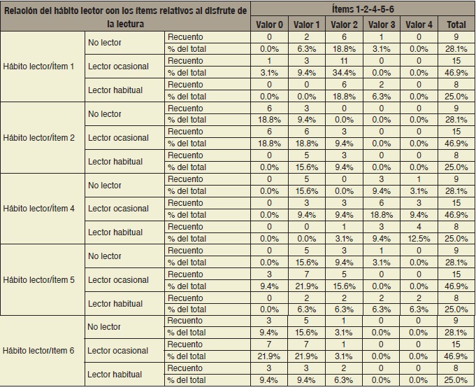 Se consideró que el hábito lector es una fuente de placer y debe tener consistencia con las acciones relacionadas al mismo. La Tabla 2 mostró dicha relación: el lector habitual disfrutó de la lectura (ítem 1), leía de manera continua puesto que la lectura la percibía como un satisfactor (ítem 2), terminaba los libros que leía (ítem 4), disfrutaba de la variedad en la lectura, no centrándose solo en libros de carácter académico que se consideran obligatorios (ítem 5) y dedicaba tiempo a este pasatiempo (ítem 6).