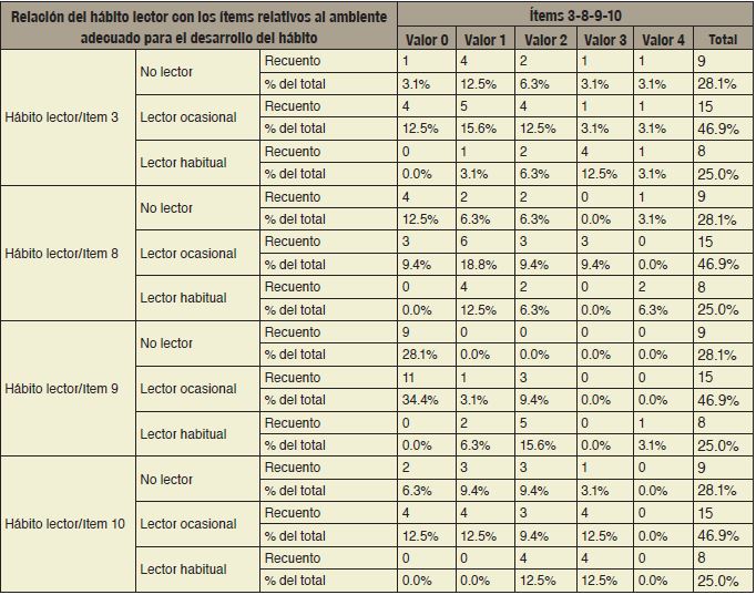 La lectura fue considerada un aprendizaje adquirido desde la primera infancia y, por tanto, el ambiente relacionado con la misma, propició o disminuyó su desarrollo. Los ítems relacionados con un entorno adecuado para la adquisición del hábito lector fueron, entre muchos otros, la existencia del estímulo de manera cercana y cotidiana (ítem 3), la motivación a desarrollar el hábito (ítem 8), la ejemplificación constante del hábito motivo del aprendizaje (ítem 9) y la consistencia con el hábito de quien modela la conducta, considerada desde su nivel académico (ítem 10). La Tabla 3 mostró la relación entre estos ítems y el hábito lector.