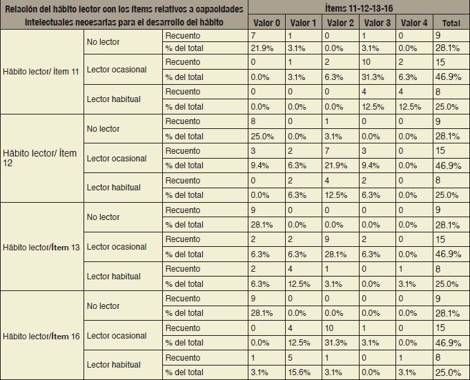 La capacidad de disfrutar de la lectura y, por tanto, de hacer de ella un hábito, conllevó a que los individuos contaran con las herramientas físicas e intelectuales suficientes para su desarrollo, entre las cuales se encontraron la facilidad para ejercitar la lectura (ítem 12), la facilidad para imaginar aquello que leían (ítem 11), la capacidad para concentrarse en la lectura (ítem 13), y la comprensión lectora (ítem 16). La Tabla 4 mostró la relación que guardan dichas variables con el hábito lector.