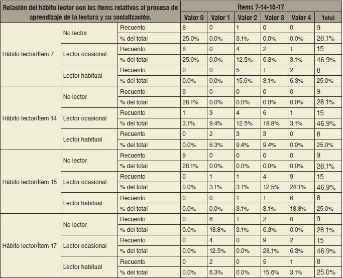 La dificultad para el aprendizaje de la lectura (ítem 14) se relaciona comúnmente con la habilidad y la rapidez para leer (ítem 15). Estos factores contribuyen a la socialización de la conducta lectora (ítem 7 y 17). El análisis de estas variables cuando se relacionan con el hábito lector, se mostró en la Tabla 5.