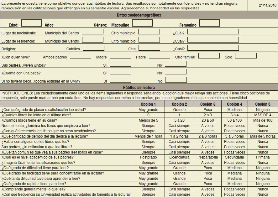 Para la recolección de los datos se diseñó un instrumento formado por 2 partes (Anexo 1). La primera se refirió a una ficha sociodemográfica del estudiante. La segunda, formada por 17 ítems tipo likert, sobre hábitos de lectura. El instrumento fue validado por jueceo con el método de agregados individuales. La escala autoadministrada fue entregada por los investigadores de manera personal y recabada 15 minutos después.