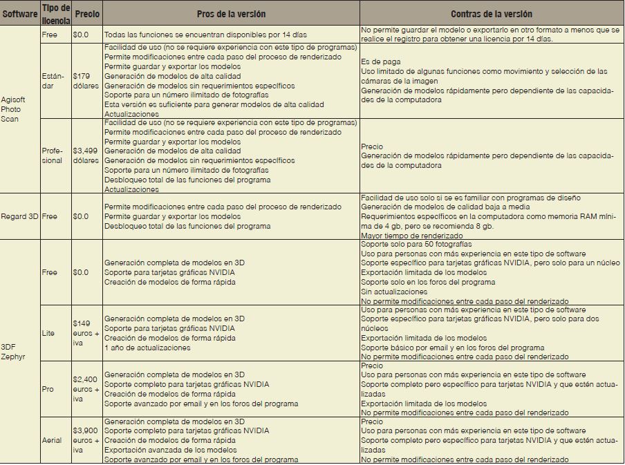 Se determinó que la versión básica pagada de Agisoft Photo Scan y 3DF Zephyr son muy superiores a Regard 3D, a pesar de contar con una licencia completa con todas las funciones de manera libre. El precio final del uso de esta técnica es de aproximadamente 900 dólares con equipos de gama básica y uso de software en su versión estándar, el cuál es 40 veces menor que contratar un equipo profesional para crear modelos.
