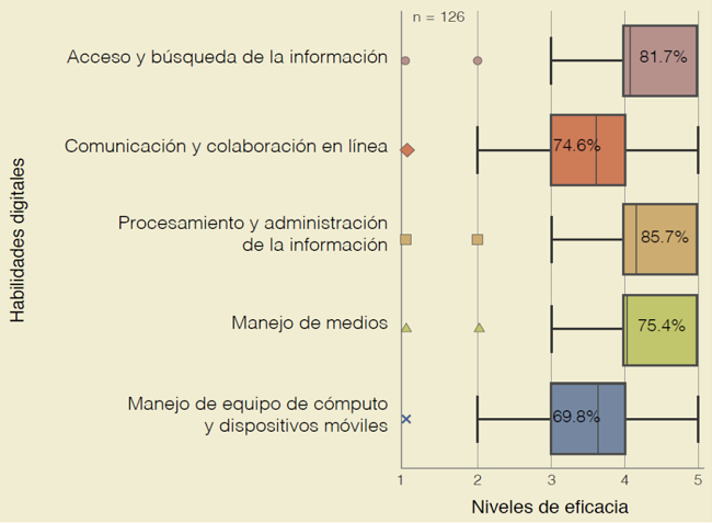 Las habilidades donde los estudiantes se percibieron con mayor nivel de eficacia fueron “acceso y búsqueda de información”, “procesamiento y administración de la información” y “manejo de medios”. Las dos primeras, son habilidades de gran importancia para la autogestión del aprendizaje, en un modelo educativo centrado en el estudiante y según los resultados esto podría ser positivo para los estudiantes.