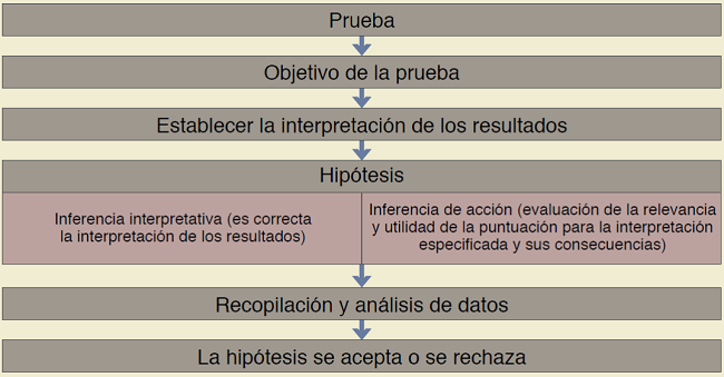 Messick menciona que un análisis de la validez siempre parte de una hipótesis o inferencia acerca de la interpretación o el uso que se pretende dar a los resultados de la prueba. Posteriormente se deben recopilar y analizar los datos, enlazarlos a un marco teórico específico, y luego determinar la validez o invalidez de la hipótesis declarada para un momento particular en el tiempo, para una población específica (figura 1).7,8