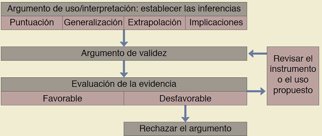 La interpretación de los resultados de la prueba implica explicar el significado de la puntuación, mientras que el uso de las puntuaciones se refiere a las decisiones que se toman con base en los resultados de la prueba. Kane considera que ambos términos (interpretación y usos) incluyen todas las suposiciones que se pueden hacer al respecto de las puntuaciones de una prueba, por lo que se debe establecer la validez de la interpretación o el uso de las puntuaciones en términos de lo creíble y apropiado que tengan en un punto del tiempo. Tener claro lo que se quiere evaluar permite elaborar un plan de evaluación preciso, por lo que el AUI puede conformar una red de inferencias y suposiciones que van desde el desempeño en las pruebas hasta las conclusiones que se obtienen, y las decisiones que se toman con base en estas conclusiones.28,29