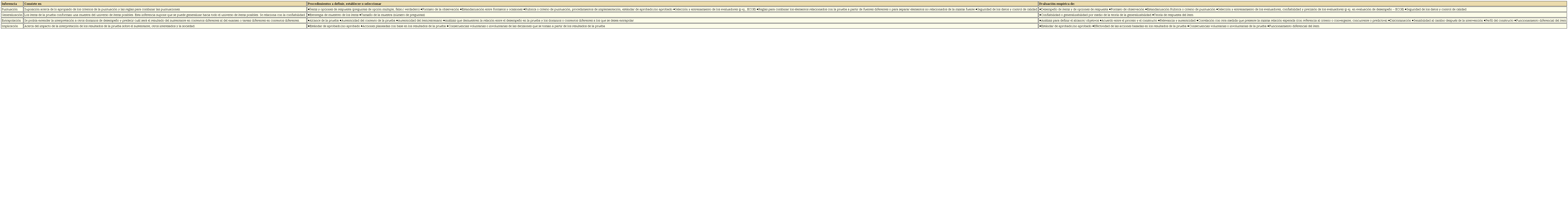 Con estas consideraciones, el primer paso será realizar un análisis conceptual del AUI y verificar que sea coherente y que todas las inferencias importantes se encuentren presentes. Posteriormente, se deberán evaluar las inferencias presentadas. En la tabla 1 se resumen las inferencias que propone Kane, así como los procedimientos que se deben definir y la manera de evaluarlos.